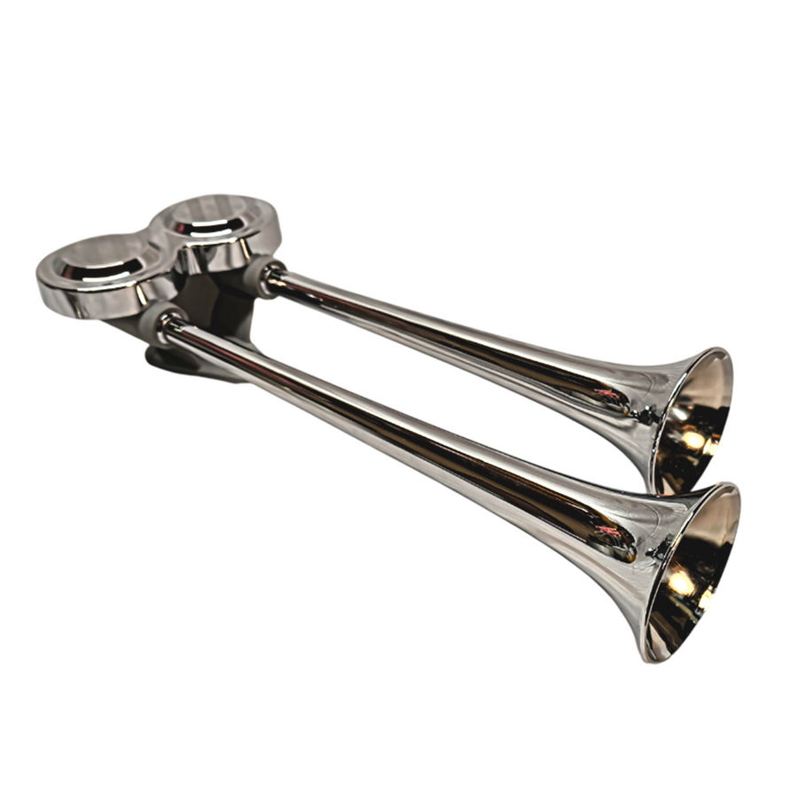 Avertisseur bicolore pour air comprimé avec trompes en métal chromé. Montage extérieur, complet avec matériel de fixation, sans soupapes de commande.